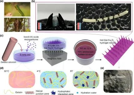 为了解决以上问题,研究人员选择猪皮的生物相容性明胶和铁(II,III)氧化微粒,形成磁性水凝胶来制作机器人,不仅可以实现生物降解,这种水凝胶可以很容易地拉伸到原始长度的200%,其中充足且自对准的磁性微粒还能在磁场输入下快速响应。