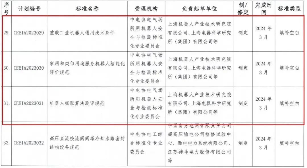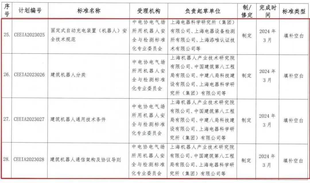 2023年3月27日,由中电协电气场所用机器人安全与检测标准化专业委员会提出的《固定式自动充电装置(机器人)安全技术规范》、《建筑机器人分类》、《建筑机器人通用技术条件》、《建筑机器人通信架构及协议导则》、《重载工业机器人通用技术条件》、《家用和类似用途服务机器人智能化评价规范》、《机器人抓取测评规范》七项团体标准,正式获得中国电器工业协会批准立项。